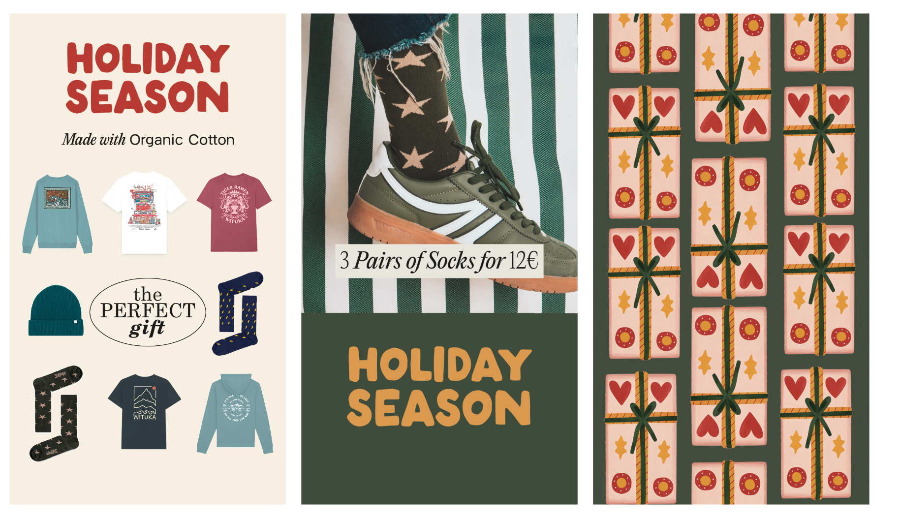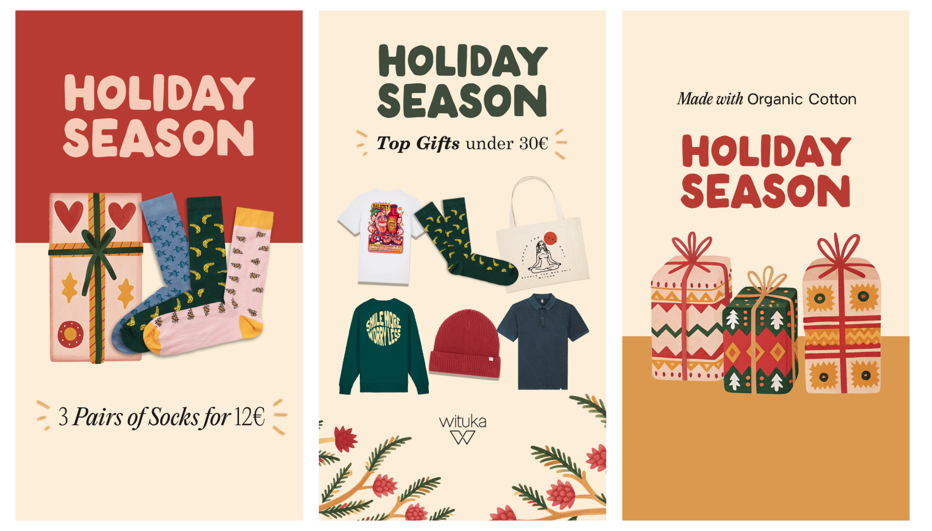 By blending earthy tones with festive elements, the campaign evokes a cozy, handcrafted holiday spirit. Illustrated gift boxes, organic shapes, and playful yet elegant typography create a warm, nostalgic feel—inviting customers to celebrate the season with sustainable, beautifully designed gifts.